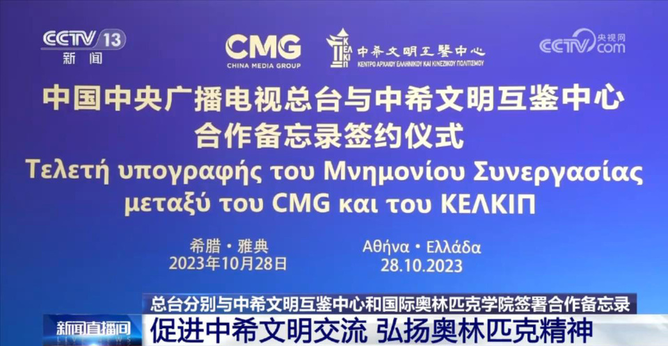 当地时间10月28日,中国中央广播电视总台分别与中希文明互鉴中心、国际奥林匹克学院签署合作备忘录,就促进中希两国文明交流互鉴、弘扬奥林匹克精神等方面达成合作。希腊总理米佐塔基斯对国际奥林匹克学院与总台深化合作及相关协议的签署表示祝贺。