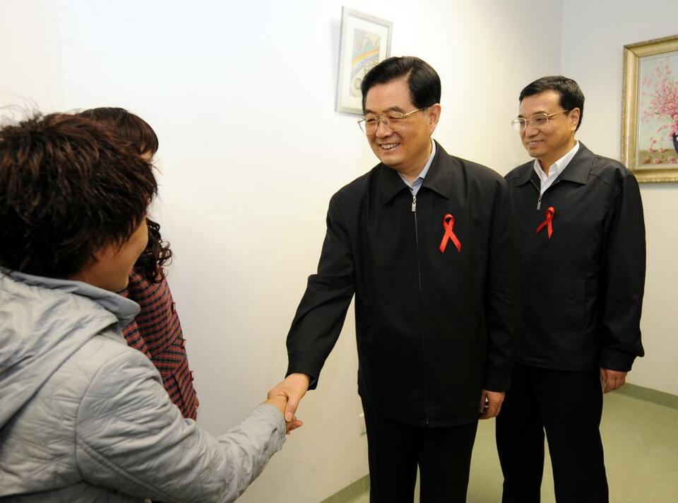 2008年12月1日是第21个世界艾滋病日。胡锦涛同志和李克强同志来到北京地坛医院考察艾滋病防治工作。