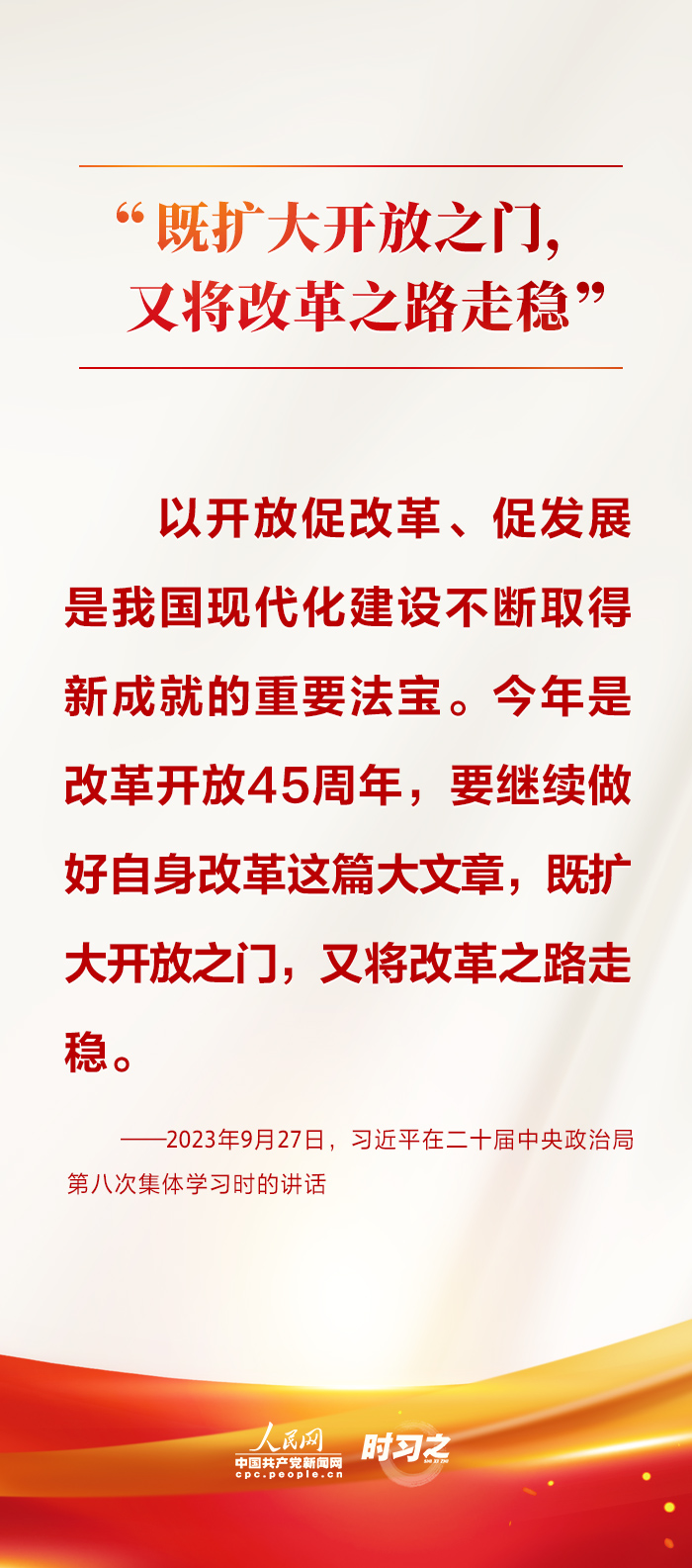 改革开放是坚持和发展中国特色社会主义的必由之路。今年是中国改革开放45周年,党的十八大以来,习近平总书记多次在不同场合强调推进改革开放的重要性,用诸多形象生动的论述深刻阐明了改革开放的历史定位和重大意义。