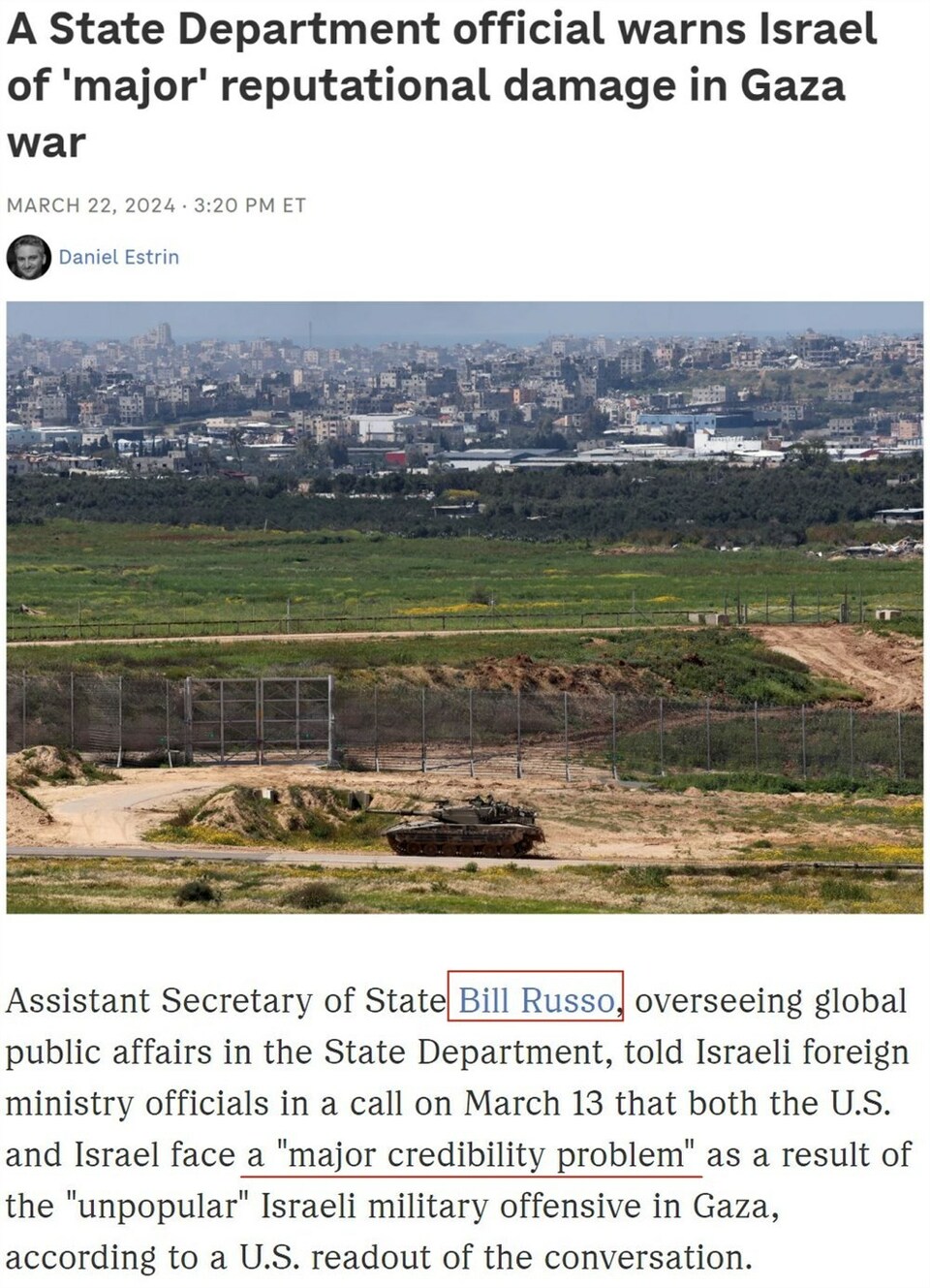 美国全国公共广播电台记者丹尼尔·埃斯特林日前披露了一份备忘录,涉及美国助理国务卿比尔·拉索3月上旬与一位以色列官员的通话。