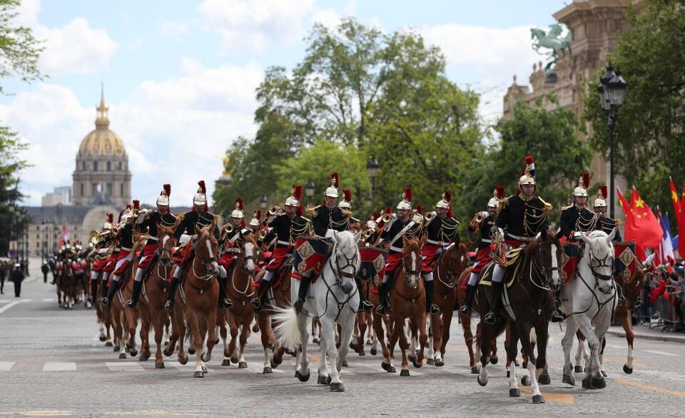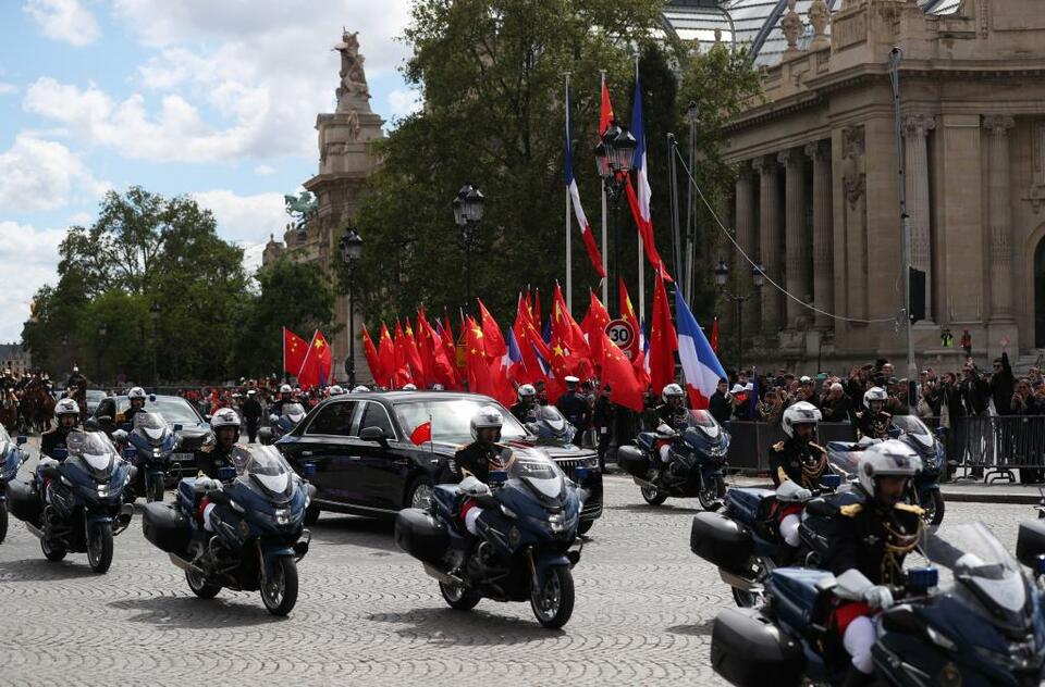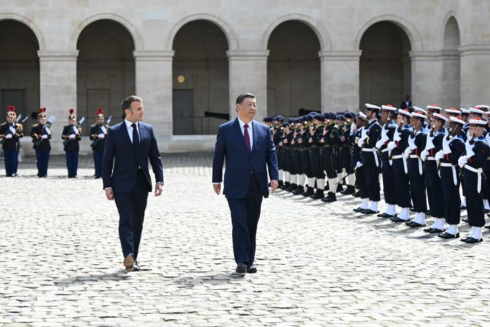 当天下午,习近平在巴黎出席马克龙举行的隆重盛大欢迎仪式。两国元首检阅法兰西共和国卫队和陆海空三军仪仗队,并观看分列式。