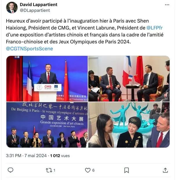 法国国家奥林匹克和体育委员会主席大卫·拉帕蒂恩:很高兴昨天与中央广播电视总台台长慎海雄先生以及法国职业足球联盟主席文森特·拉布伦先生一起在巴黎参加了一场中法艺术家展览的开幕式,这场展览是为了庆祝中法友谊以及即将到来的2024年巴黎奥运会。