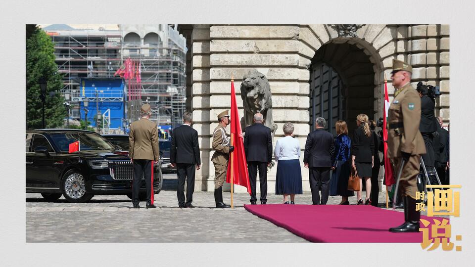 △习近平主席乘车抵达布达王宫,舒尤克总统夫妇和欧尔班总理夫妇在习主席下车处提前等候,热情迎接。