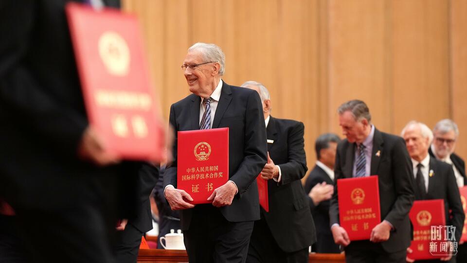 △获奖的外籍科技工作者,奖章的背面刻有获奖者姓名。(总台国广记者李晋、央视记者姚瑶拍摄)