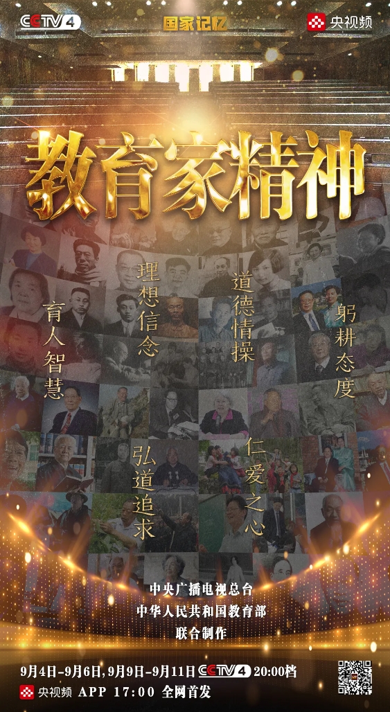 纪录片《教育家精神》共分六集,分别为《心有大我 至诚报国》《言为士则 行为世范》《启智润心 因材施教》《勤学笃行 求是创新》《乐教爱生 甘于奉献》《胸怀天下 以文化人》,将于9月4日起在总台中文国际频道(CCTV-4)晚8点档《国家记忆》栏目首播,每天播出一集。9月4日至6日播出第一至第三集,9月9日至11日播出第四至第六集,同步在央视网、央视频等网络媒体上线。