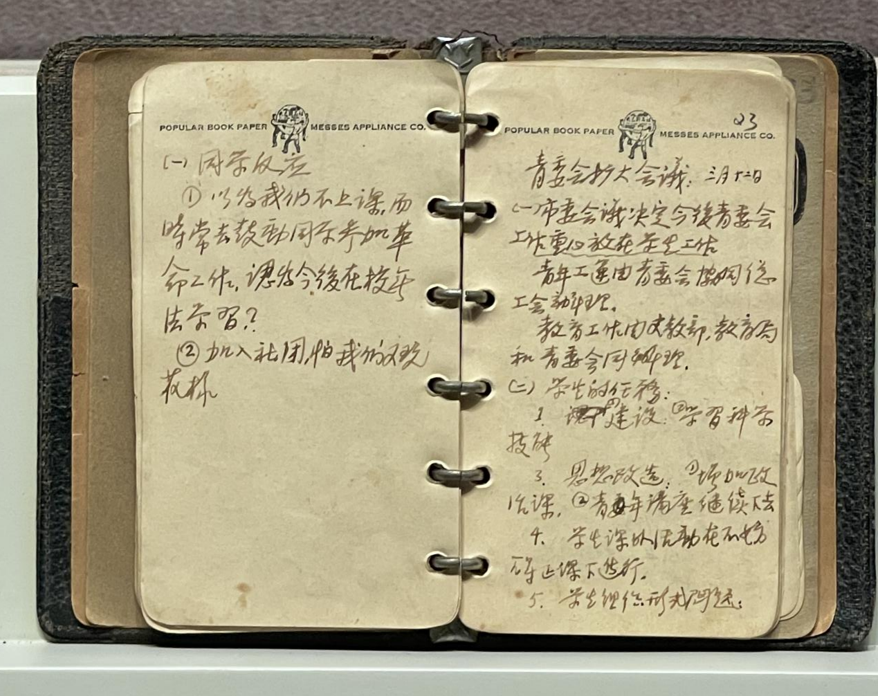 纪念馆展柜中,一个巴掌大小的黑色硬皮笔记本格外引人注目。它的捐赠者是已故的南开大学历史学院教授刘焱。1948年11月平津战役打响前,时为南开大学哲学教育系学生的刘焱被党组织任命为中共天津地下党学委委员兼南开大学总支书记。平津战役纪念馆所收藏的这个笔记本,就是他担任党总支书记期间随身携带的工作记录本。