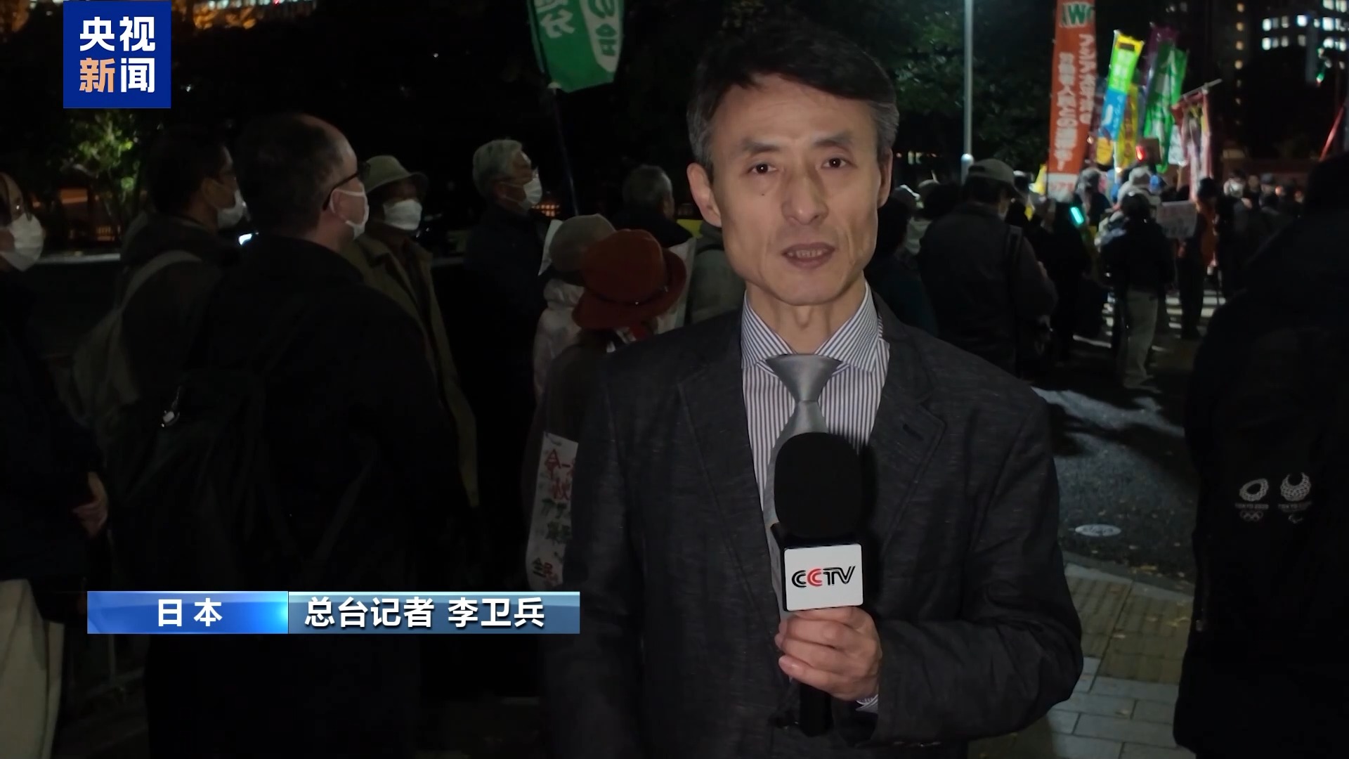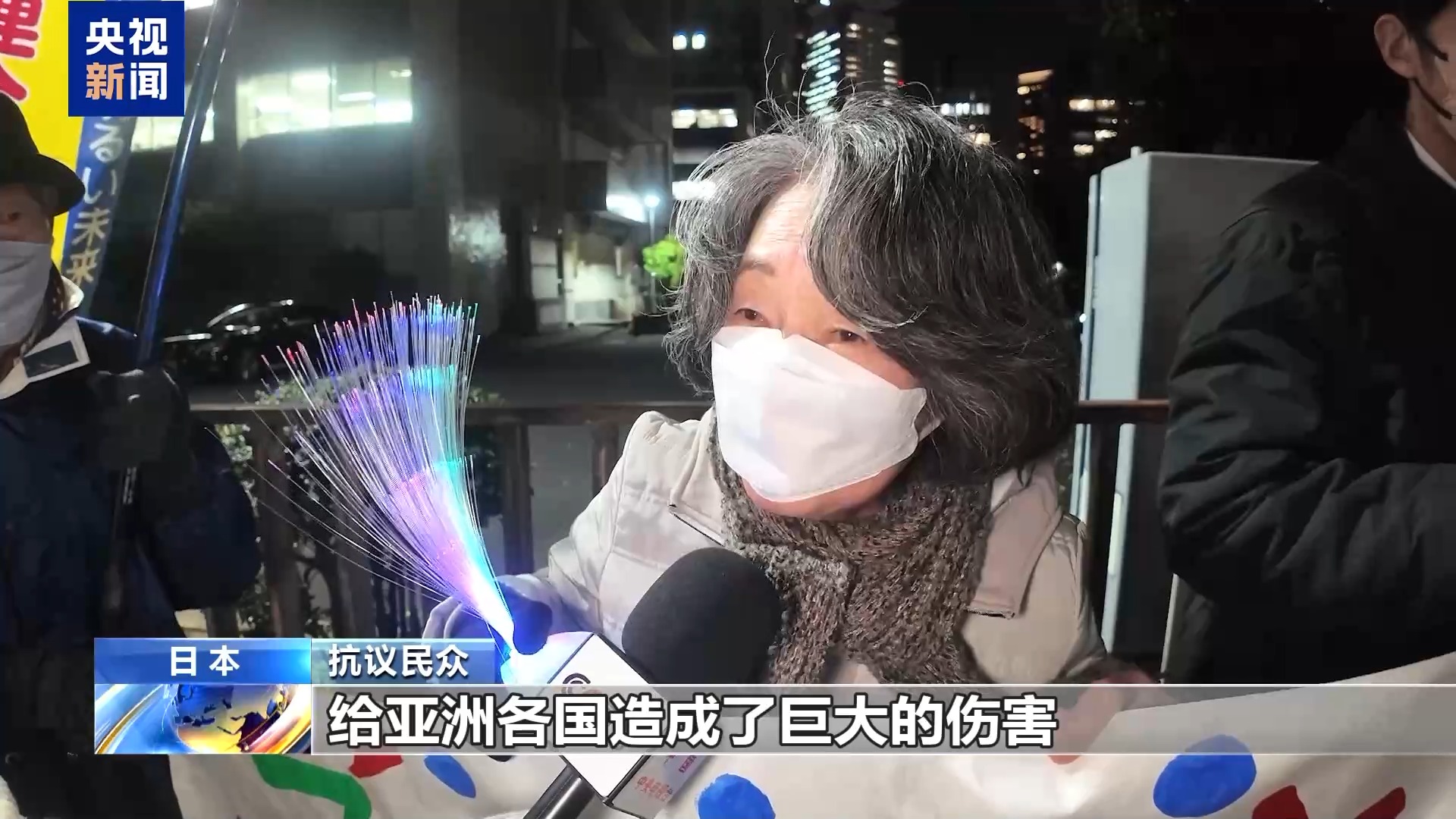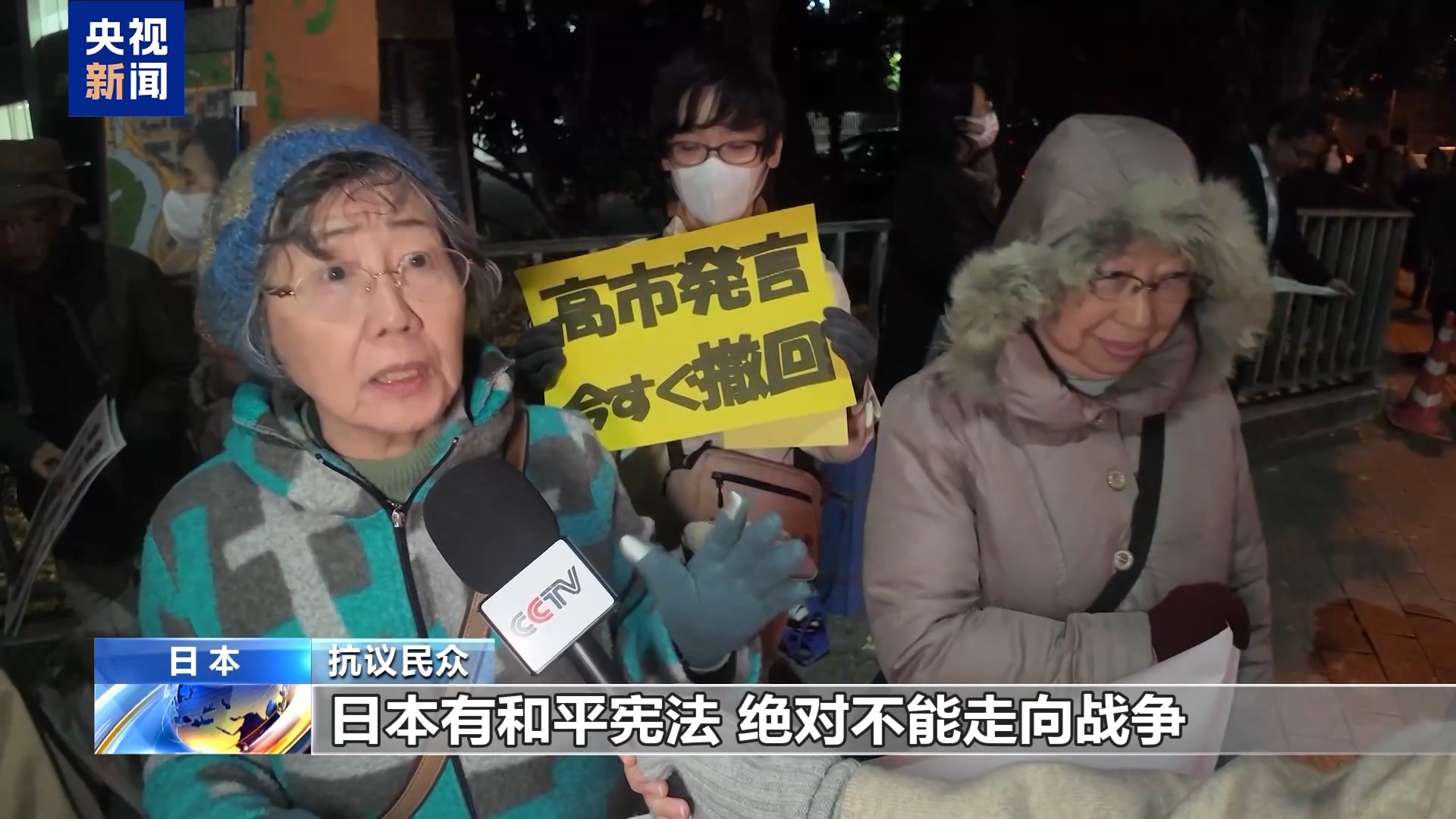 总台记者 李卫兵:12月4日晚上,日本民众再次自发聚集在首相官邸前,举行抗议集会,要求日本首相高市早苗立即撤回煽动战争的涉台错误言论。