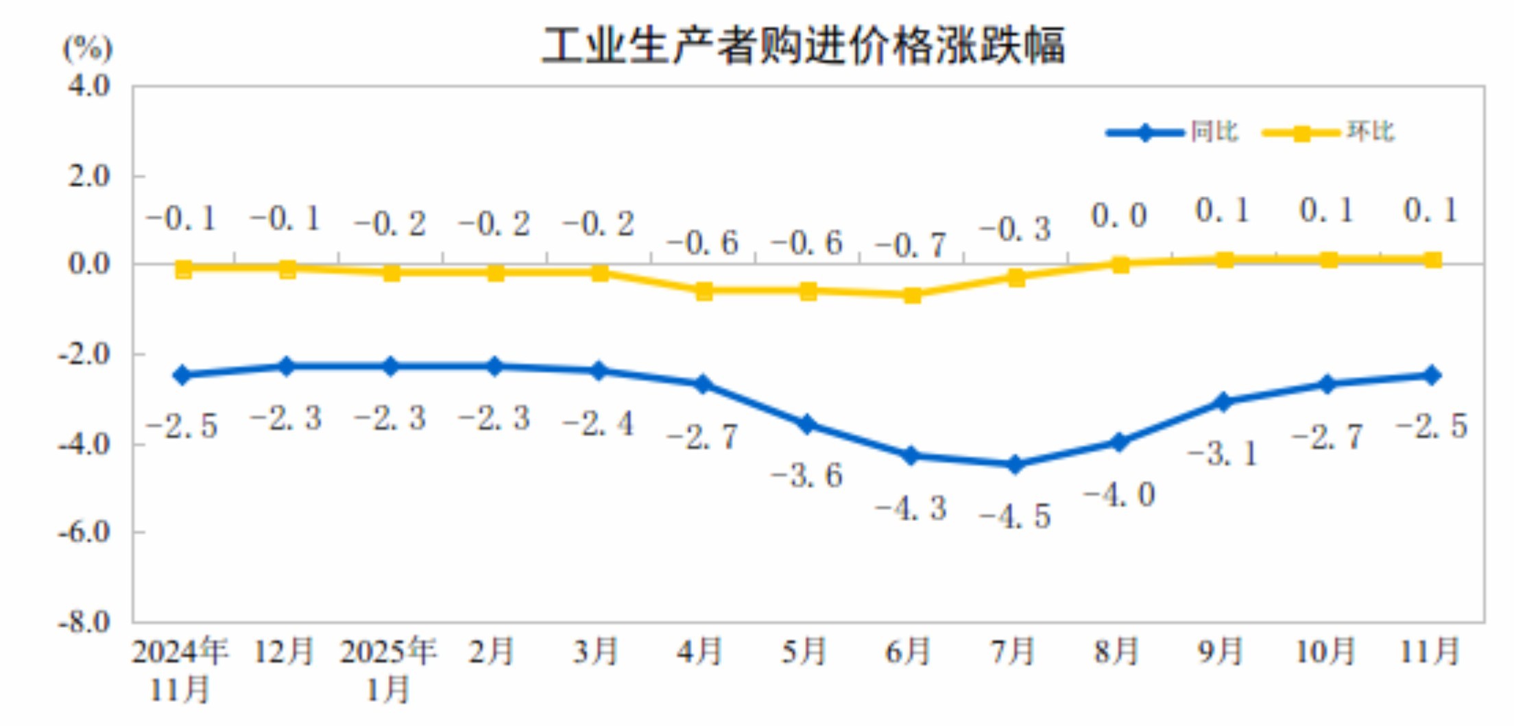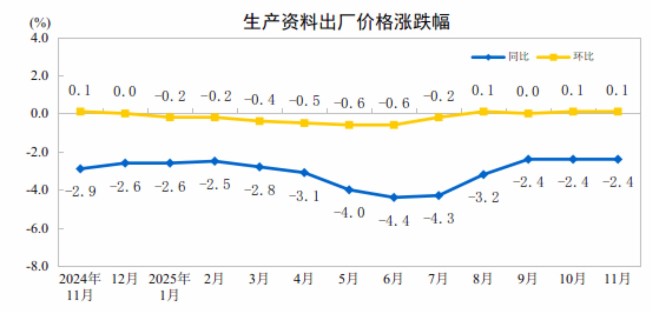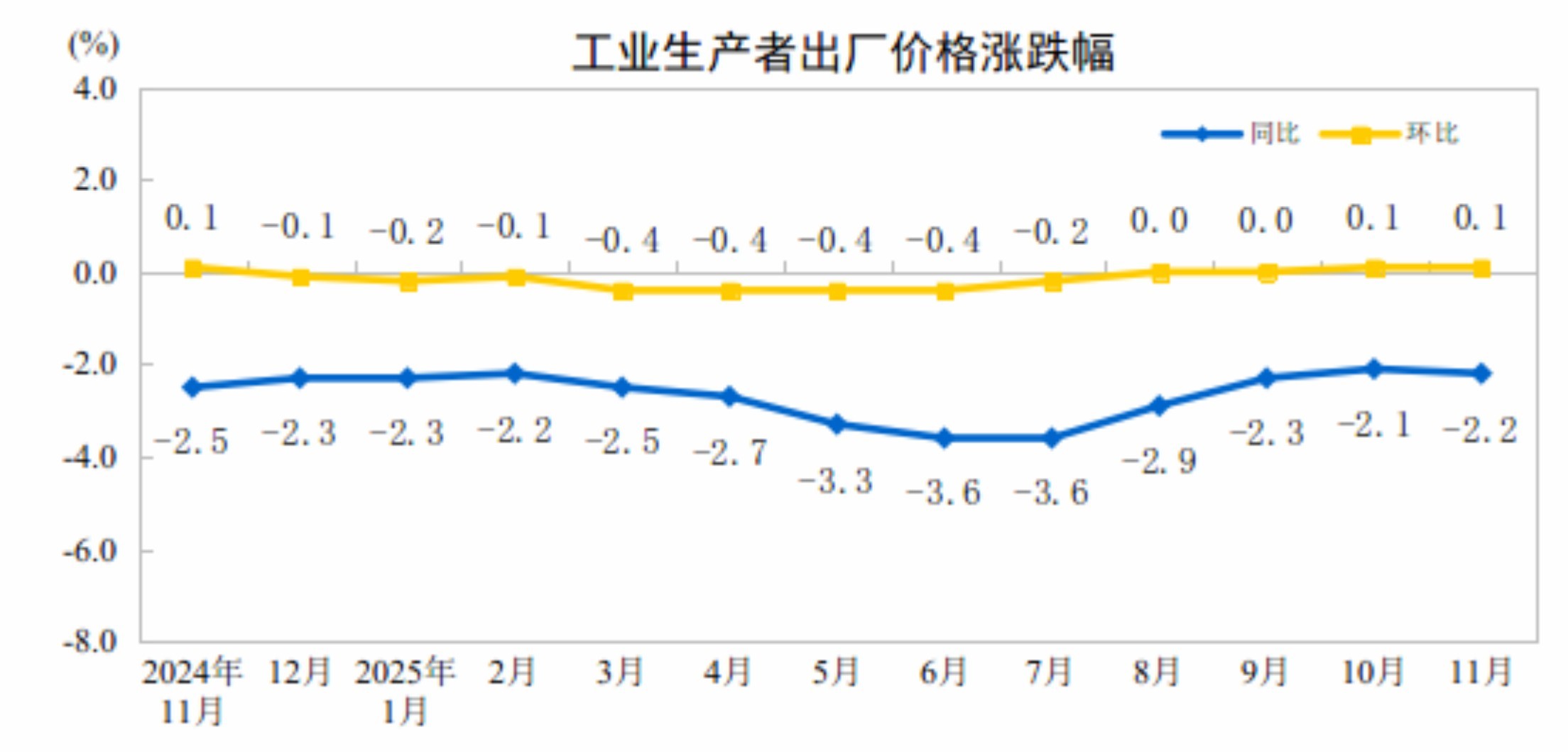 据国家统计局消息,2025年11月份,全国工业生产者出厂价格同比下降2.2%,工业生产者购进价格同比下降2.5%;工业生产者出厂价格和购进价格环比均上涨0.1%,涨幅均与上月相同。1—11月平均,工业生产者出厂价格比上年同期下降2.7%,工业生产者购进价格下降3.1%。
