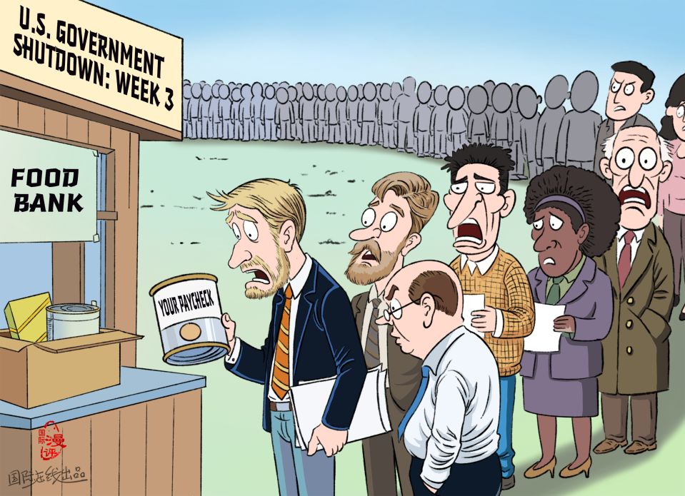 The U.S. federal government shutdown has lasted for three weeks. In Washington, D.C., furloughed federal employees—unpaid for weeks—lined up for hundreds of feet outside a local food bank, waiting to receive free groceries to get by. As economic pressure on these workers mounts, political blame games and accusations between the two parties continue unabated. With no compromise in sight, there is still no sign of the government shutdown ending.