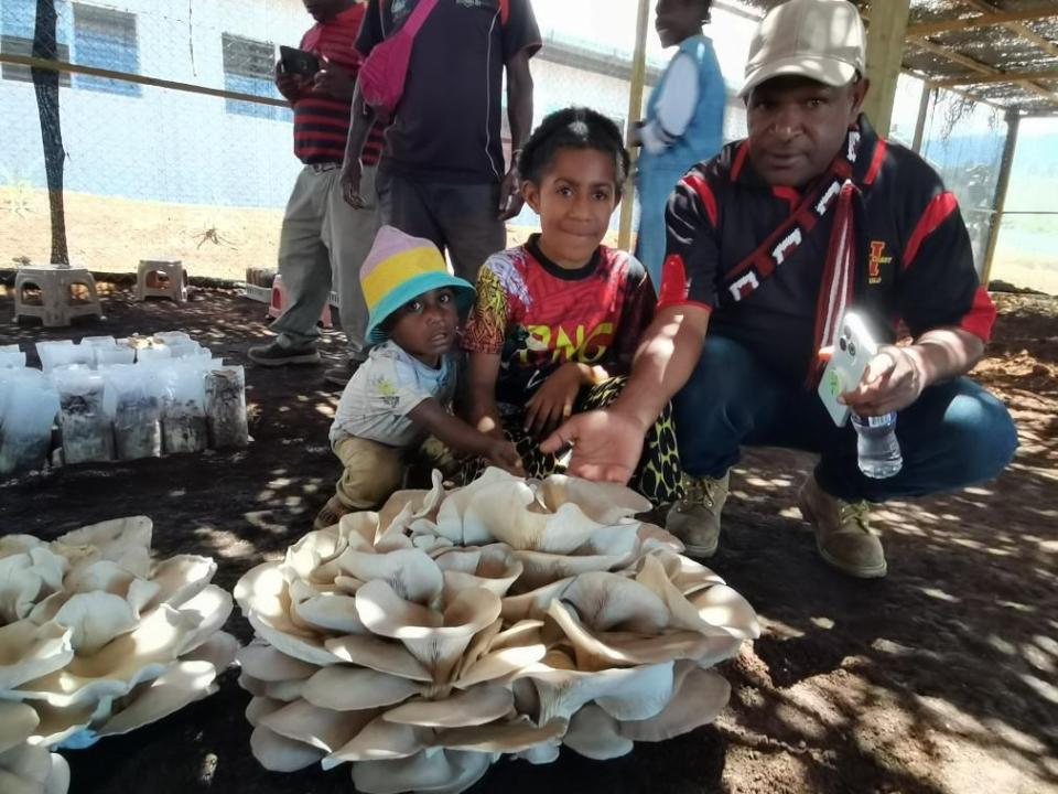 △2025年9月29日,在巴布亚新几内亚东高地省首府戈罗卡市,当地民众参观中国援巴布亚新几内亚菌草旱稻项目永久性示范基地。