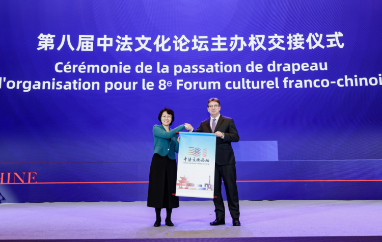 闭幕式现场举行了第八届中法文化论坛主办城市交接仪式,长沙市副市长钱丽霞把象征论坛在中法两国城市之间轮替举办的会旗交到法方代表法兰西岛大区埃松省参议员大卫·罗斯手中。