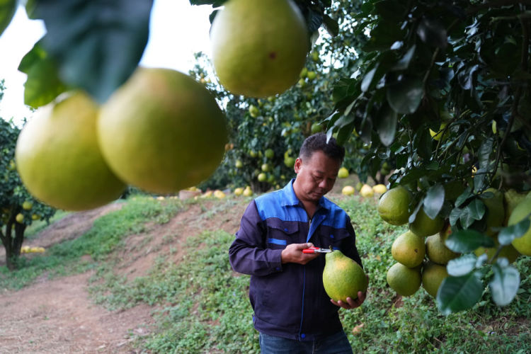 2025年6月12日,工作人员在广东省梅州市梅县区农业科学研究所检查柚子生长情况。