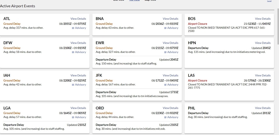 纽约地区三大机场8日均因人手短缺出现航班延误。截至8日16时,纽瓦克自由国际机场(EWR)入港航班平均延误超过327分钟,出港延误约150分钟且预计将进一步增加;拉瓜迪亚机场(LGA)入港延误近一小时,出港延误约105分钟并持续上升;肯尼迪国际机场(JFK)平均延误167分钟,并一度实施地面停飞令。与此同时,芝加哥、拉斯维加斯及奥斯汀等城市的多座机场亦因相同原因被下令暂时停飞。
