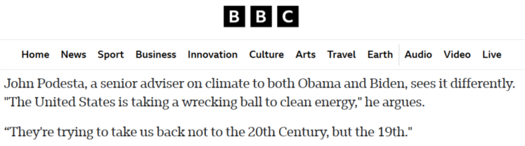 在各国政府共同制定并落实气候政策之际,美国作为全球历史累计碳排放量最大的国家则明确表示,不派遣高级官员与会并取消多项气候承诺。英国广播公司在11月10日的报道中引用曾担任奥巴马和拜登气候问题高级顾问的约翰·波德斯塔的话称,“美国正在对清洁能源进行毁灭性打击”,他们“想把我们带回的不是20世纪,而是19世纪”。