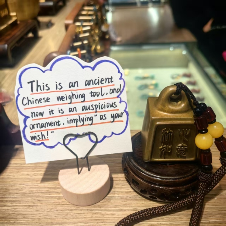 “有位南美客人,去年来买过小秤和算盘,今年进博会期间又特地来,还带了懂中文的同事。”苏彦滨回忆,这位客人每次都会买五六件不同的挂饰,“去年买的是基础款,今年我们推荐了新款葫芦,他一听‘能带来福气’,立刻就下单了。”为了方便外国客人理解,民艺馆还制作了英文台卡,把“称心如意”翻译成“as you wish”,把“富甲一方”的乌龟壳挂件配上英文注解。