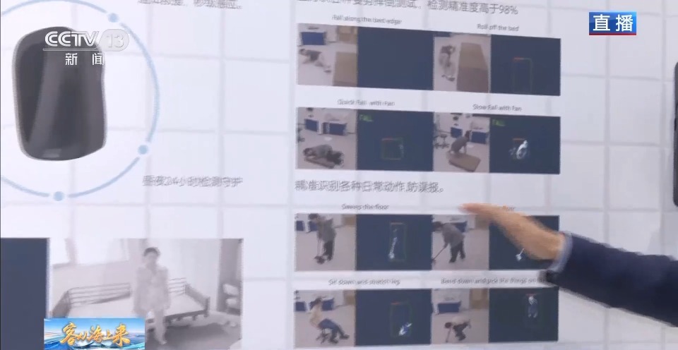 数字技术正在拓展直播的边界,也在延伸关爱的视线。在直播区的旁边有一个摄像头,下方的8张图片是居家监测画面,这是一套老年人跌倒监测系统,我们正常在家里活动或者做家务的时候,这个监测系统在后台运行,当出现上面这几种情况的时候,联网的手机App上就会显示“FALL”的报警字样和语音提示,及时通知到家人。