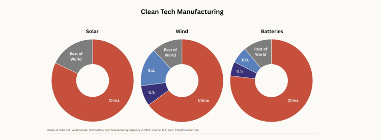 2023年太阳能电池、风力机舱和电池单元制造产能的占比图(来自《耶鲁环境360》网站)