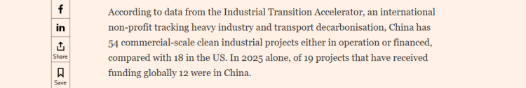 文章援引追踪重工业和交通运输脱碳的国际非营利组织“工业转型加速器”(Industrial Transition Accelerator)的数据报道称,中国目前有54个商业规模的清洁工业项目已投入运营或获得融资,而美国为18个。仅2025年,全球已获得融资的19个项目中,就有12个位于中国。