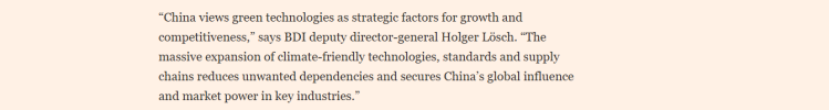 文章援引德国工业联合会(BDI)副总干事霍尔格·勒施的话表示,“中国将绿色技术视为经济增长和竞争力的关键因素。中国在气候友好型技术、标准和供应链等方面的大规模扩张,减少了不必要的对外依赖,并巩固了其在关键行业的全球影响力和市场地位。”