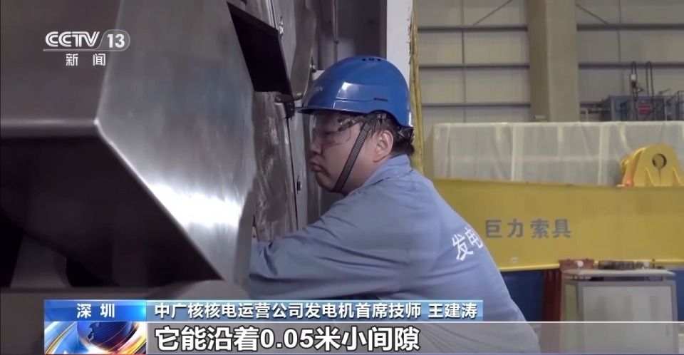 中广核核电运营公司发电机首席技师 王建涛:发电机抽转子检修是发电机检修中风险最高、工期最长、投入人员最多的工作,要花三四十人连续工作十几个小时,稍微一碰撞造成的经济损失达几亿。小小的机器人可以像孙悟空变成小人一样,它能沿着0.05米小间隙进入发电机完成各种检修和实验,节约大量的检修时间,5个人把工作干完,节约大量的人力。