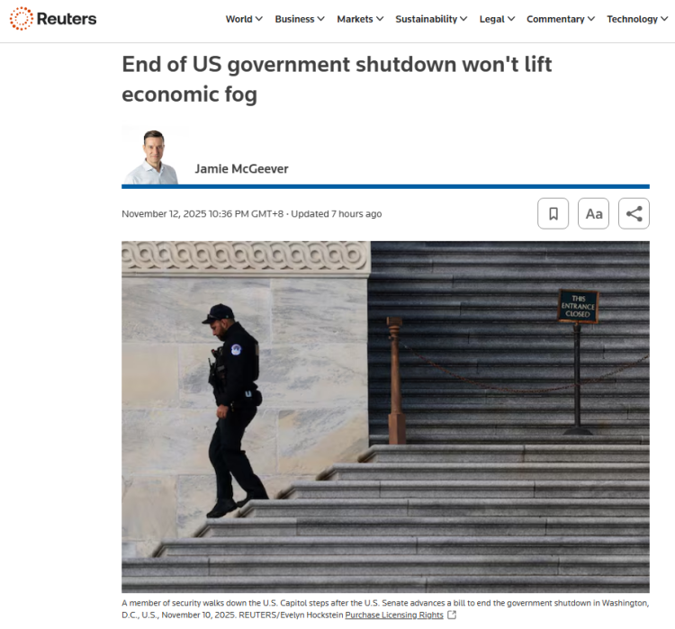 路透社网站11月12日刊登一篇专栏作者的文章指出,美国政府有史以来最长的停摆或将结束,这意味着美国官方经济数据即将公布。即使投资者和美联储松了一口气,但他们即将获得的数据可能也并不完全可靠。