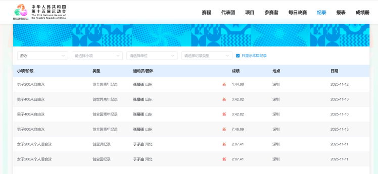 十五运会游泳项目目前超越、打破的纪录(十五运会官方网站截图)