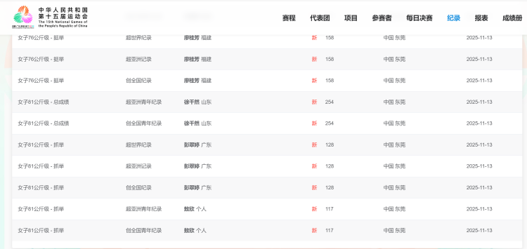 十五运会举重项目目前超越、打破的部分纪录(十五运会官方网站截图)