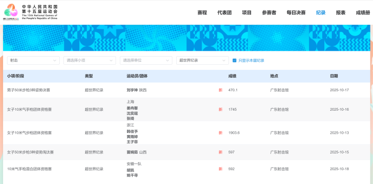 十五运会射击项目超越的世界纪录(十五运会官方网站截图)