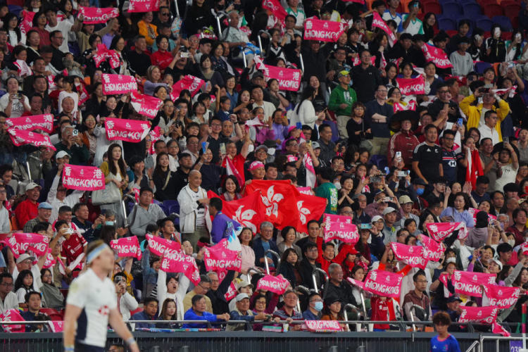 11月14日,在香港举行的第十五届全国运动会7人制橄榄球男子决赛中,球迷在场边加油助威。新华社记者 朱炜 摄