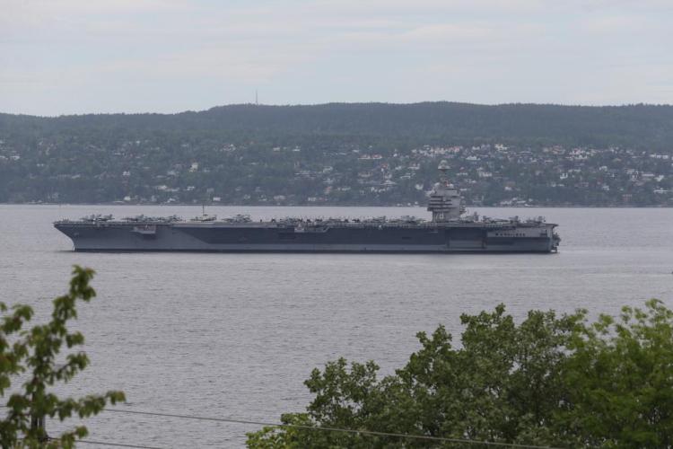 2023年5月24日,美国“杰拉尔德·R·福特”级航空母舰首舰“福特”号停靠在挪威首都奥斯陆的峡湾中。新华社记者张玉亮摄
