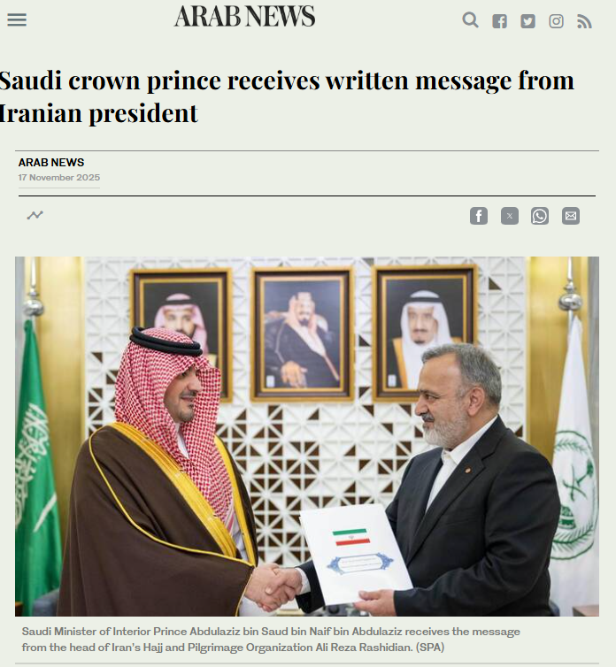 沙特阿拉伯王储兼首相穆罕默德11月17日晚启程前往美国开展工作访问前,收到了伊朗总统佩泽希齐扬的书信。沙特内政大臣阿卜杜勒阿齐兹•本•萨乌迪•本•纳伊夫在内政部办公室也接收了伊朗朝觐组织负责人阿里礼萨•拉希迪安转交的总统书信。