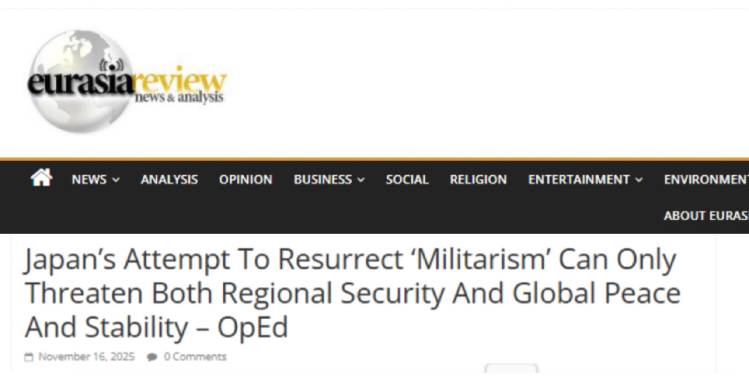 国际在线专稿:近日,日本首相高市早苗公然宣称“台湾有事”可能构成日本可行使集体自卫权的“存亡危机事态”,暗示可能武力介入台湾问题,该错误言论持续引发国际舆论哗然。美国《欧亚评论》网站近期刊发题为《日本企图复活“军国主义”只会威胁地区安全和世界和平与稳定》的深度评论文章,指出高市早苗的错误行径正将日本推向危险边缘,其涉台挑衅言论绝非孤立事件,背后是日本右翼势力长期作祟。日本此举严重破坏地区和平稳定,损害中日战略互信,并加剧对抗风险,国际社会必须对复活日本军国主义的图谋保持高度警惕。