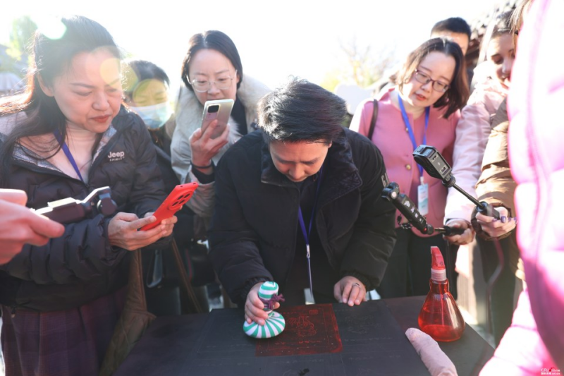 中国翰園碑林の拓本体験コーナーでは、甲骨文字、百家姓、十二支、唐詩・宋詞、名言・警句など、多様な碑刻がたちまち外国人ファンの関心を集め、実際に体験するきっかけとなった。ラオス人インフルエンサーのKhamphilom Vannaphone氏は、宣紙を湿らせて碑刻に優しく被せ、拓包で素早く力強く均等に叩き、瞬く間に精美な「羊」干支の文字拓本を完成させた。彼は作品を掲げ、周りに見せながら「これが私の干支です。とても不思議です!」と興奮した面持ちで語った。