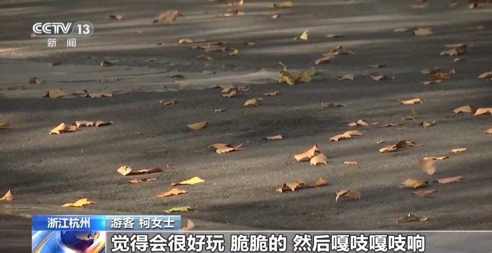 游客 柯女士:它就是自然而然地落在地面上,就很漂亮,而且路人可以踩一踩,我觉得会很好玩,脆脆的嘎吱嘎吱响。