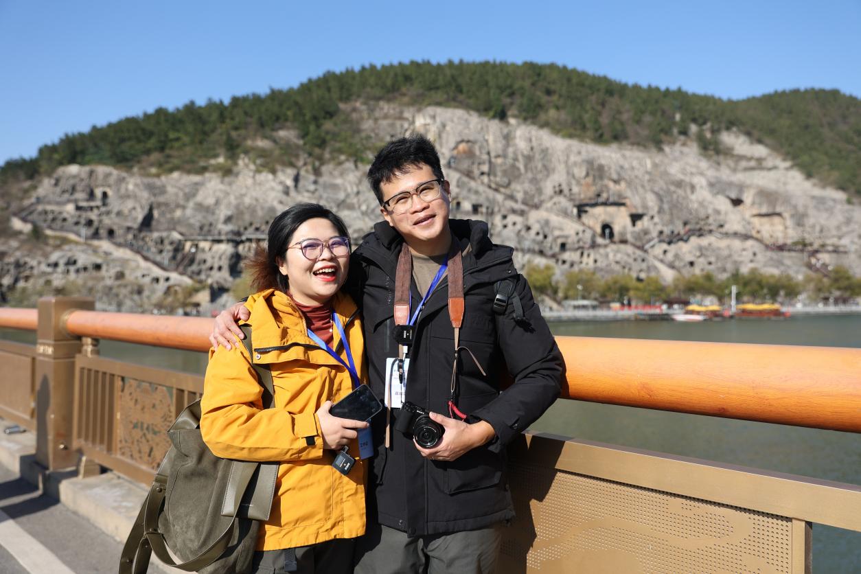 Le couple d'influenceurs thaïlandais Akenarong pose devant les grottes de Longmen pour prendre des photos