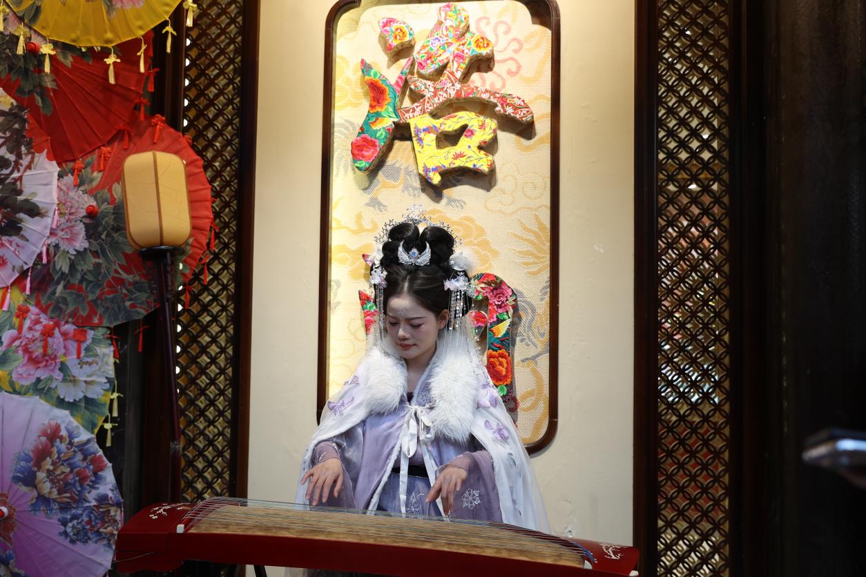 Sur les pavés de pierre bleue, le couple égyptien Nouran se croit transporté à l'époque fantastique des Tang. Les jeunes filles vêtues de hanfu les fascinent : « On ne peut plus s'arrêter de prendre des photos ! J'aimerais moi aussi enfiler un hanfu et remonter le temps jusqu'à la dynastie des Tang. »