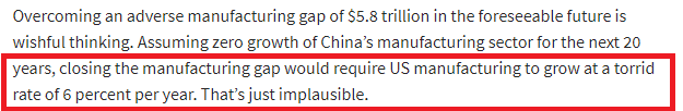 文章最后说,在可预见的未来,想要弥合美中制造业产值的巨大差距,简直是痴人说梦。假设未来20年中国制造业规模零增长,美国制造业想要弥合差距,就必须以每年6%的惊人速度增长,而这根本不可能。