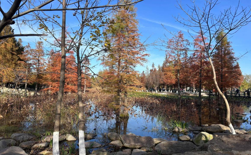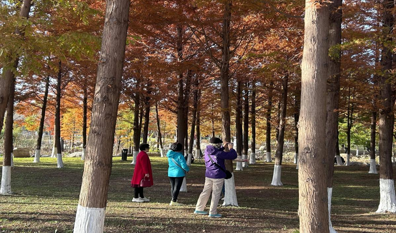 바람이 숲 사이를 스쳐 메타세쿼이아 잎이 사각사각 떨어지며 땅 위에 알록달록한 '낙엽 카펫'을 깔아 놓은 듯하다. 공원 안에는 경치를 즐기려는 현지 시민들의 발길이 끊이지 않고, 멀리서 찾아온 관광객들도 적지 않아 숲 사이 산책로를 거닐며 풍경을 감상한다.