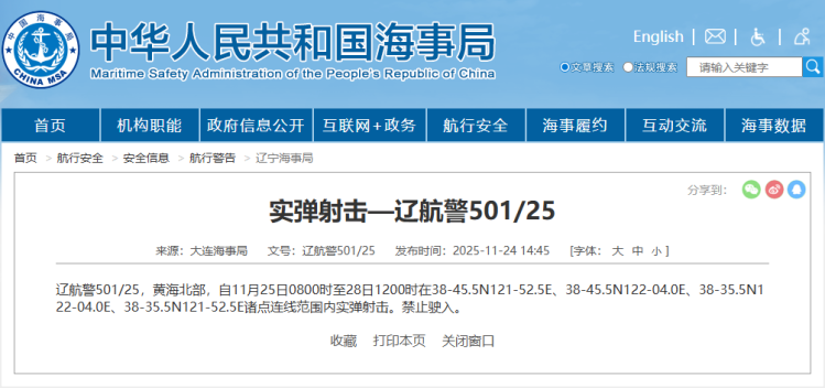 大连海事局11月24日发布航行警告,自11月25日8时至28日12时,黄海北部部分海域实弹射击,禁止驶入。