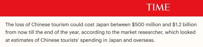 此外,美国《时代周刊》网站24日刊登的报道指出,中国从渔业到流行文化等多个领域对日本施加了压力。而根据市场研究人员对中国游客在日本和海外消费的估计,从现在到年底,中国游客的流失可能会对日本造成5至12亿美元的损失。