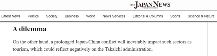 文章分析,日中关系紧张将不可避免地影响到日本旅游等领域,这将对高市政府产生负面影响。
