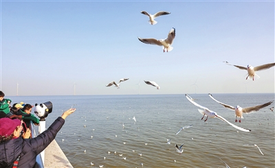 冬日,众多游客在东疆亲海公园观赏海鸥。(记者 吴迪 摄)