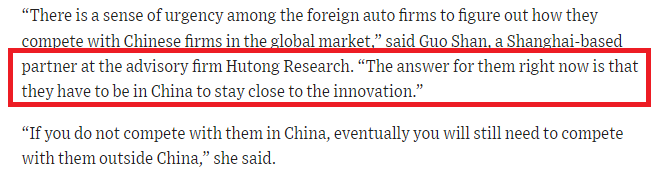文章指出,对于许多外国汽车制造商来说,在中国开展业务意味着更贴近市场动态和供应链。 文章援引上海政策研究机构胡同研究(Hutong Research)合伙人郭珊的话表示,“外国汽车公司迫切需要弄清楚如何在全球市场上与中国公司竞争,对他们来说,目前的答案是必须留在中国,才能紧跟创新步伐。就算你不在中国参与竞争,最终你还是需要在海外市场与他们竞争。”