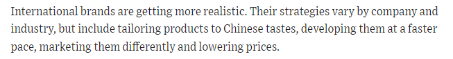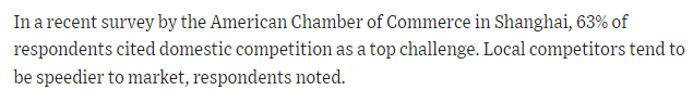 文章指出,跨国公司都十分重视中国——这个拥有着14亿人口、有着巨大消费市场和潜力的国家。但对于不少跨国企业来说,近年来,由于实力强劲的中国本土竞争对手的崛起,市场竞争加剧,跨国公司的利润空间被大幅压缩。