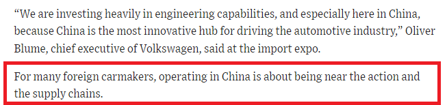 文章以表现尤为明显的汽车行业举例。文章说,德国大众汽车曾是中国市场的销量冠军,但本土品牌比亚迪在2023年夺得了这一桂冠。大众汽车最新季度在华交付量同比下降了7%。这家德国汽车制造商正在大力推行其“在中国,为中国”的战略,即在中国研发和生产专门面向中国消费者的产品。上个月在上海举办的第八届中国国际进口博览会上,大众汽车展示了专为中国消费者设计的新款车型,这些车型的研发速度比以往车型快了约30%。大众首席执行官奥利弗·布鲁姆(Oliver Blume)在进博会上表示:“我们正在大力投资工程技术能力,尤其是在中国,因为中国是推动汽车行业发展的最佳创新中心。”