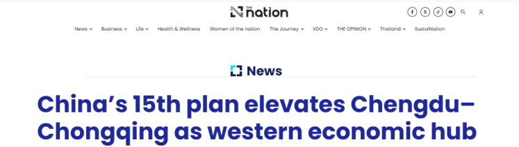 泰国《国家报》发文指出,成渝地区地理位置优越,地处“一带一路”和长江经济带交汇点,同时也位于连接中国西部与东南亚的西部陆海新通道上。中国“十五五”期间将继续着力打造成渝经济圈,使其成为中国西部新的增长中心,其中成都将成为创新和文化中心,而重庆将朝着高端制造业和物流业领先地位迈进。