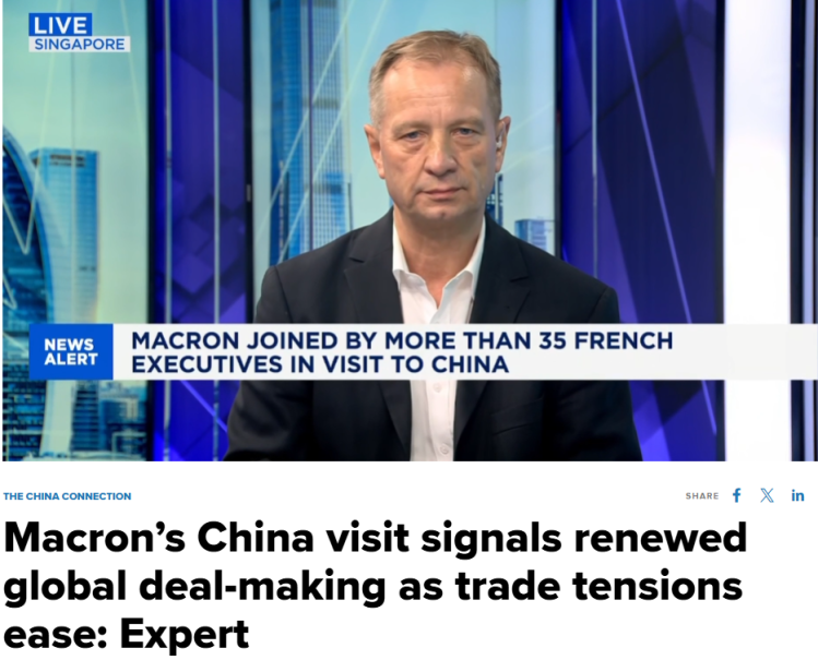 新加坡国立大学东亚研究所所长阿尔弗雷德・席睿德在接受采访时认为,马克龙此次出访不仅有望收获重要的商业成果,更将在欧洲与中国之间长期存在的重要贸易问题上推动双方在关键议题寻求突破。