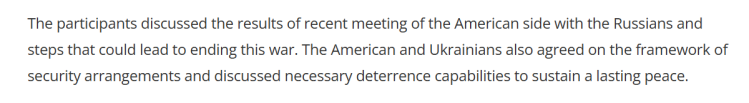 美国国务院此前一天发表声明说,美乌代表团连续两天举行会谈,讨论了美方与俄罗斯近期会谈的结果以及可能促成结束当前战事的措施,就“安保安排框架”达成一致,并讨论了维持持久和平所需的威慑能力。