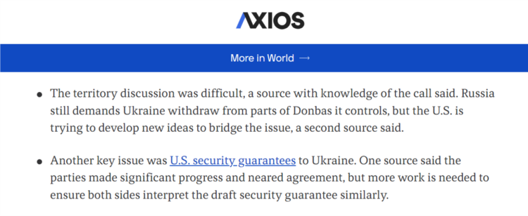 报道援引知情人士的话称,领土问题的讨论很艰难,俄罗斯仍要求乌克兰从乌控制的顿巴斯部分地区撤军,美国正试图提出新方案。另一个关键问题是美国对乌克兰的安全保障问题。一名消息人士说,双方取得了显著进展,接近达成协议,但仍需进一步磋商以确保双方对安全保障草案的解释一致。