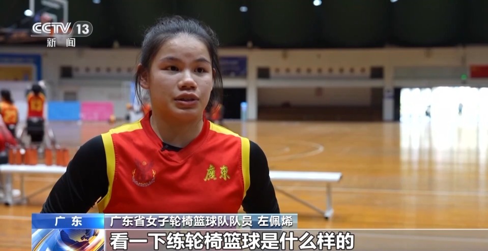 广东省女子轮椅篮球队队员左佩烯:因为自己健全的时候,在学校有玩过篮球,就想试一试,看一下练轮椅篮球是什么样的。